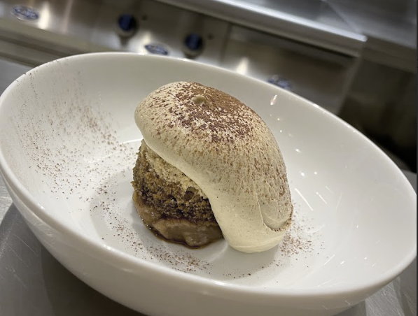 - Tiramisu à l’orge maltée, champignon de Paris, marié au Stout fumé vanille de la Brasserie De Dochter Van de Korenaar.